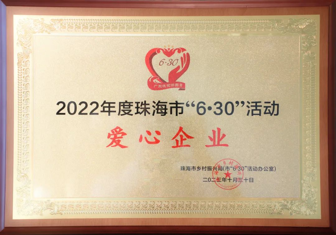 為深入貫徹黨的二十大和中央農村工作會議精神,落實市委、市政府關于統籌實施鄉村振興戰略和“百縣千鎮萬村高質量發展工程”工作部署,匯聚更多社會力量參與“6·30”活動,鞏固脫貧成果、助力鄉村振興、促進共同富裕,根據《中共珠海市委農村工作領導小組〈關于印發珠海市2023年“6·30”助力鄉村振興活動工作方案〉的通知》(珠委農組〔2023〕6號)精神,市鄉村振興局(市6·30活動辦)開展2022年度珠海市“6·30”活動“愛心企業、愛心團體、愛心個人”評選活動,向社會傳遞珠海人民樂善好施的精神品德,激發社會各界共襄善舉、助力鄉村振興。經評審,珠海大橫琴集團有限公司(以下簡稱大橫琴集團)被授予2022年度珠海市“6·30”活動“愛心企業”榮譽稱號。
