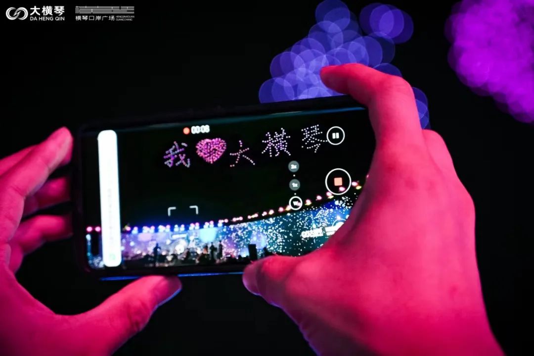 當(dāng)晚,橫琴口岸正上空,還演繹了一場(chǎng)點(diǎn)亮夜空、打破傳統(tǒng)的星空大秀。一架架無(wú)人機(jī)排著整齊的隊(duì)列,在夏日的夜空里亮起了點(diǎn)點(diǎn)星光。機(jī)群盤旋上升匯聚,在空中先后編織出“我愛(ài)橫琴”、“25”、“金蓮花”等一個(gè)個(gè)絢麗的方陣,在夜空中留下了一個(gè)個(gè)美好的祝福,而在場(chǎng)的觀眾也隨著無(wú)人機(jī)方陣的變化,許下對(duì)琴澳協(xié)同發(fā)展的美好期許。