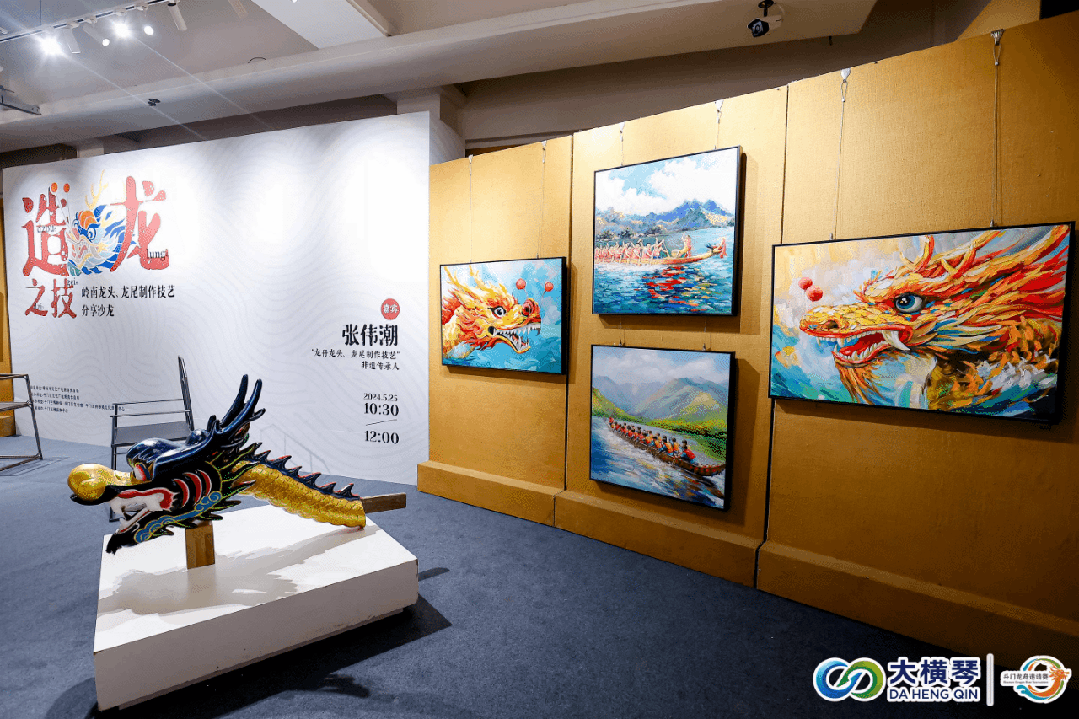 斗門龍舟賽深厚底蘊,不僅僅是一場水上競渡,更是一系列民俗文化的集大成者。睇龍船、嘆非遺,與比賽同步進行的,還有“龍騰黃楊——珠海龍舟民俗文化藝術(shù)展”和傳承人張偉潮分享的“端午龍舟龍頭龍尾制作技藝”沙龍。